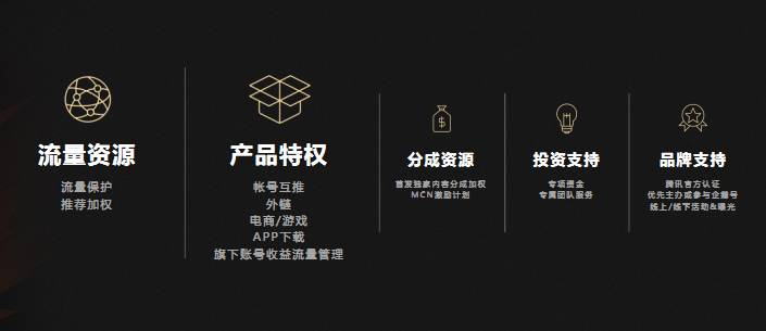 腾讯将在每个领域和地域培养MCN机构,并对它们给予额外的流量支持。比如同一机构下可以账号互推;可以插入外链,引导商品购买和游戏下载;成立专项资金支持和团队服务;优先参与腾讯主办或参与的活动曝光。