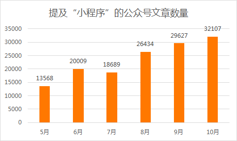 从7月开始,小程序获得大量曝光,使用新榜的文章搜索功能,以“小程序”为关键词检索,可以看到提及小程序的文章处于不断增长的状态: