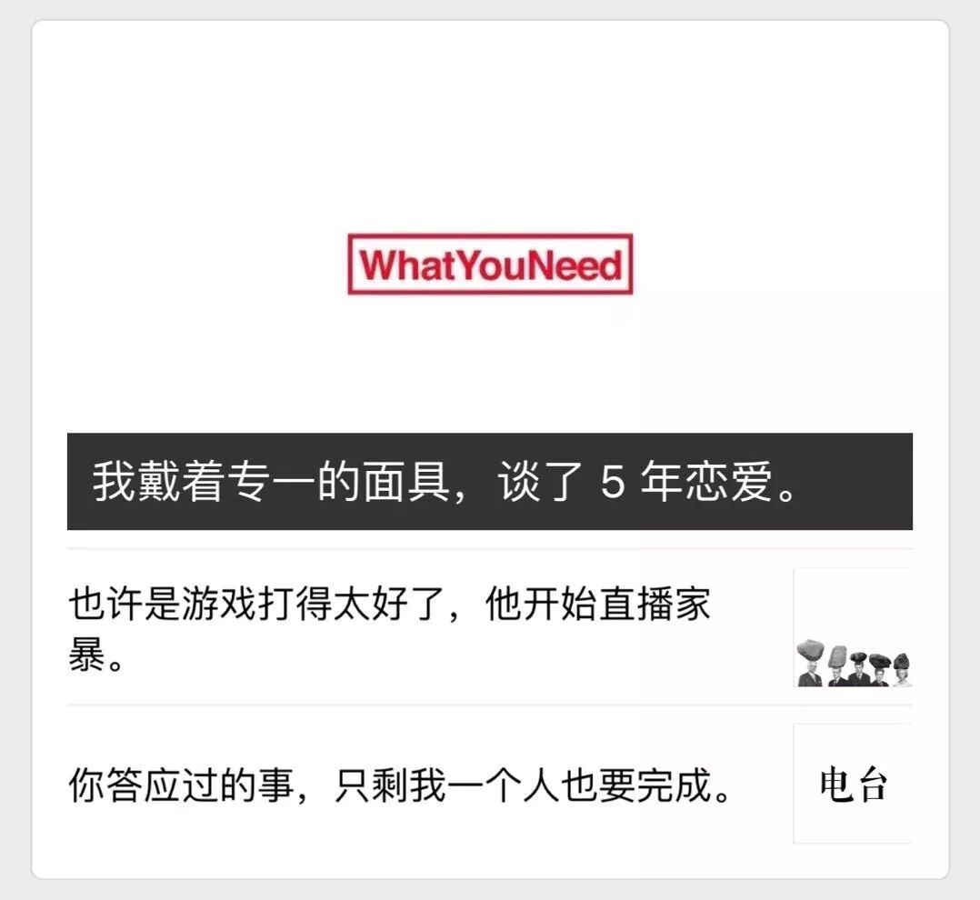 比如,“我要WhatYouNeed”的头图索性永远是白底加logo,次条小图也几乎万年不变。
