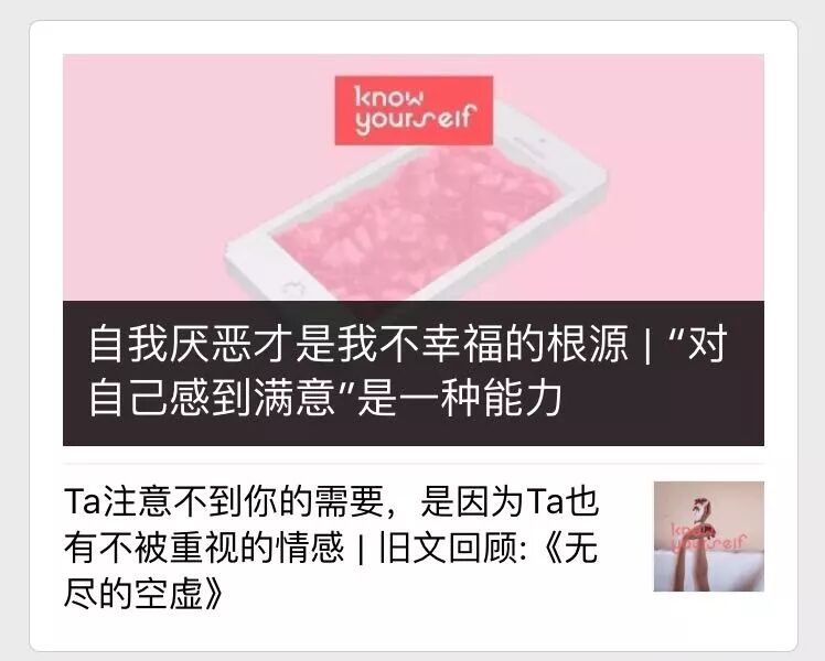 “KnowYourself”在推送两条图文时,头图和次条小图也会保持风格统一,除了画风和色调的和谐之外,在图上都刷上自己的水印。