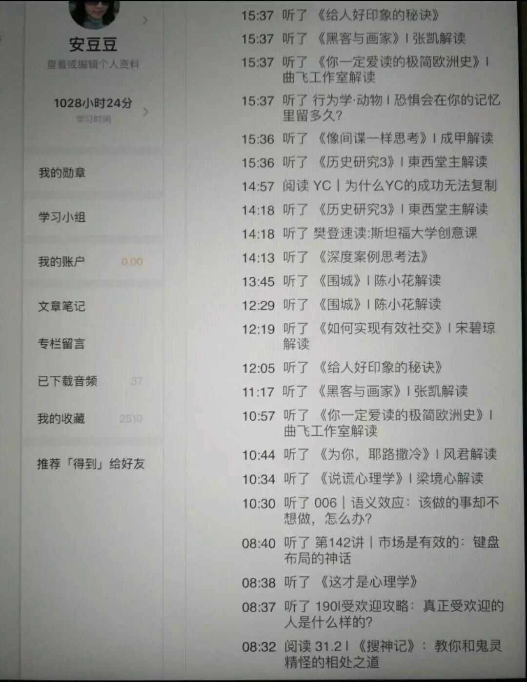 像徐琳这样对知识付费狂热的人,得到上有很多。双十一期间,得到举办有奖活动,收集了347篇文章。排名第一的文章就是《订了15个专栏,我是怎么学习的?》。作者“安豆豆”学习时间超过1000小时,“只要耳朵有空闲,基本就用在得到上”。