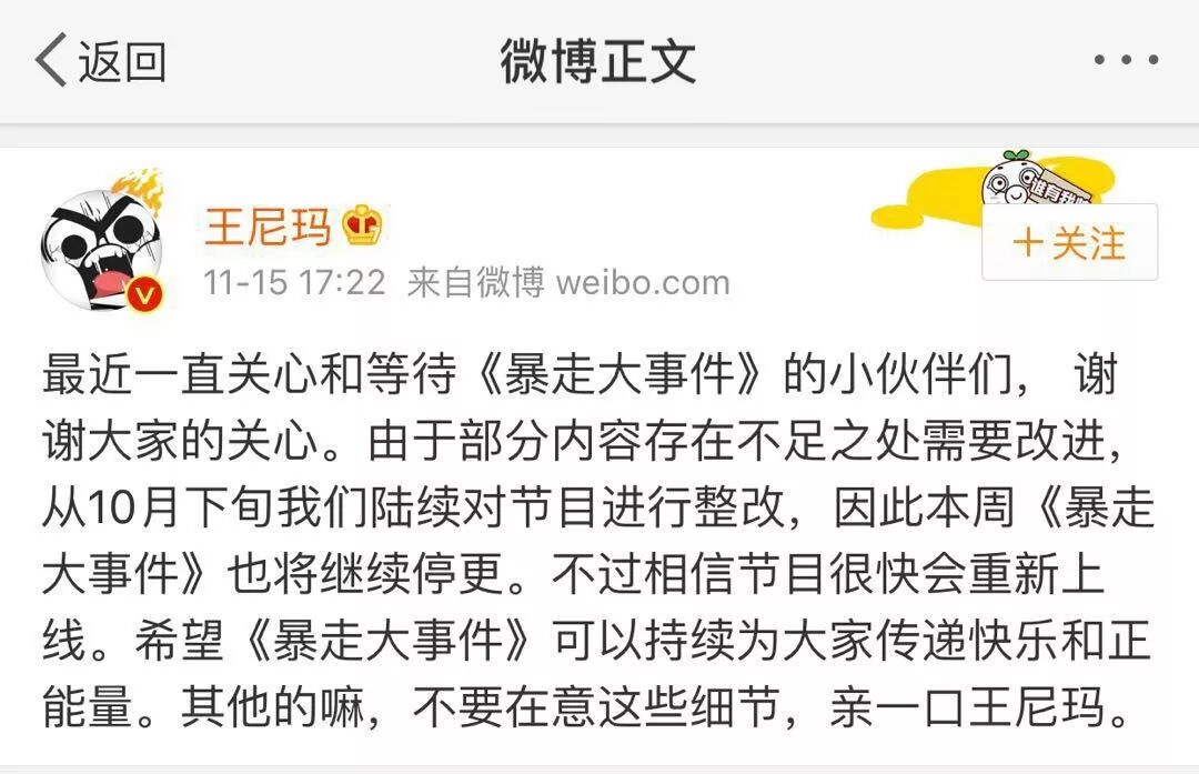 新榜讯 近来,不少网友发现《暴走大事件》10月27日的最新一期播出后,不但再没有更新过,五季节目更是全部下架,引起诸多关注。 王尼玛官方微博今天(11月15日)发布消息,称目前《暴走大事件》正在停更整改,“不过相信节目很快会重新上线”。 更多资讯,敬请关注新榜公众号(ID:newrankcn)。 以上内容使用新榜编辑器发布。新榜编辑器,多平台一键分发、海量在线图片搜索、大数据帮你了解“什么值得写”、丰富的样式中心,可能是全中国最好用的编辑器。 博主吉良 公众号迁移 中年危机 原创成本 改名金拱门 规避侵权 时尚牛尔 头部政务号 搜索工具 融资首发 订阅号改版 称呼小编 二条逆袭 新世相图书 真叫卢俊