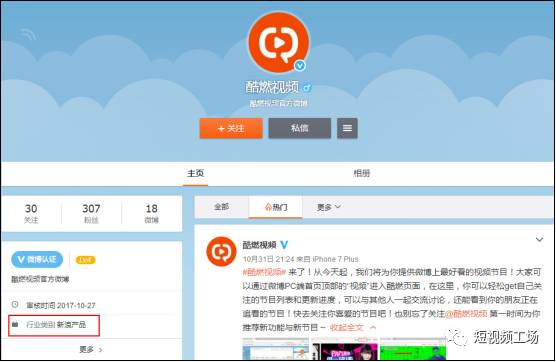 然而,场妹关注到“酷燃视频”的微博认证消息,其行业类别处标明的是“新浪产品”,而不像“秒拍”的认证信息为“新浪微博官方短视频应用”、行业类别写的却是“其它”。