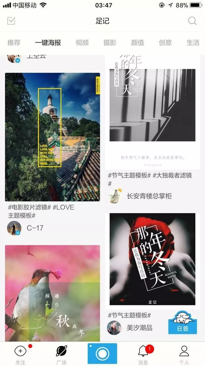 2015有一款刷屏App,足记,最辉煌的业绩是曾经一天之内新增36万用户。当年火起来最核心的功能是“一键海报”功能,也就是将你拍摄的照片一键P成知名电影海报风格的功能,比如《这个杀手不太冷》,《哈利波特》、《罗马假日》之类的海报画风,将摄影照处理的更文艺,让照片营造出电影大片的既视感,换个角度讲,加强你对生活更美好的感受。就像他的slogen“像电影一样记录生活。”