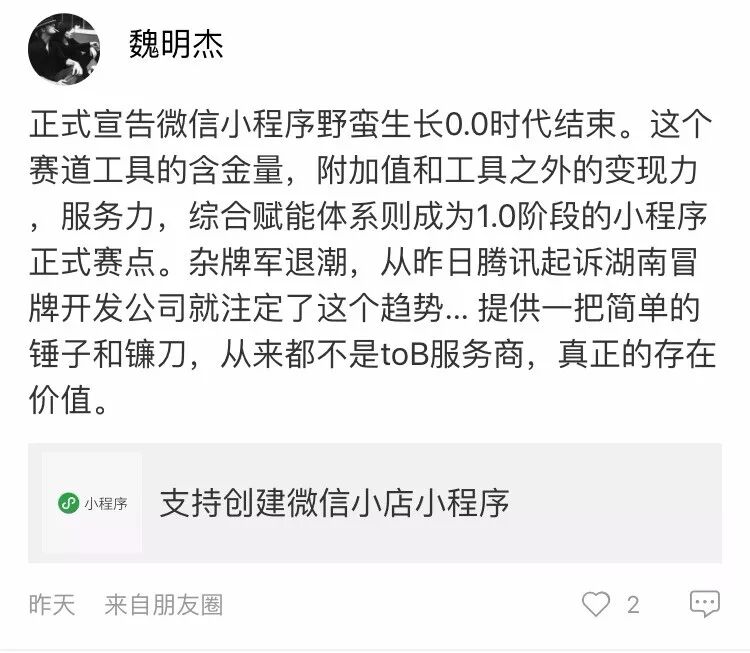 靠谱小程序创始人魏明杰在微见单方面宣布:“微信小程序野蛮生长时代0.0结束。”
