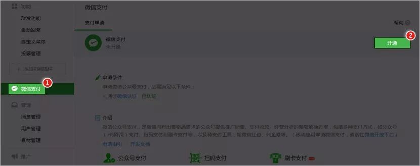 榜妹:在微信公众号后台,点击“微信支付”,就可以找到开通的界面。