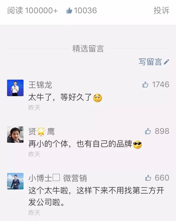 在昨天首发《支持创建微信小店小程序》的“微信公众平台”上,推出当晚即破10w+,目前点赞数破天荒的超过1万,后台评论一片欢腾。