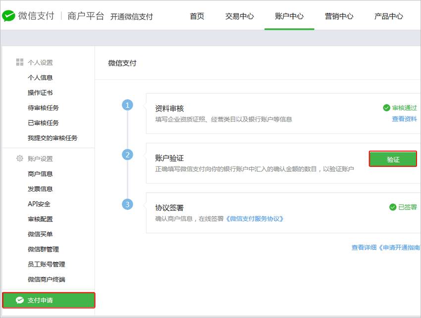 第二步是账户验证,验证将跳转到商户平台进行。通过正确填写微信支付向申请人的银行账户中汇入确认金额的数目,来验证账户。