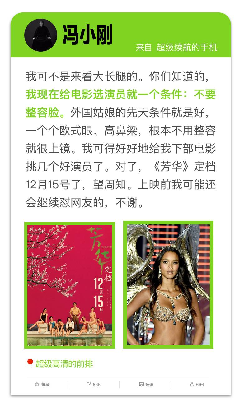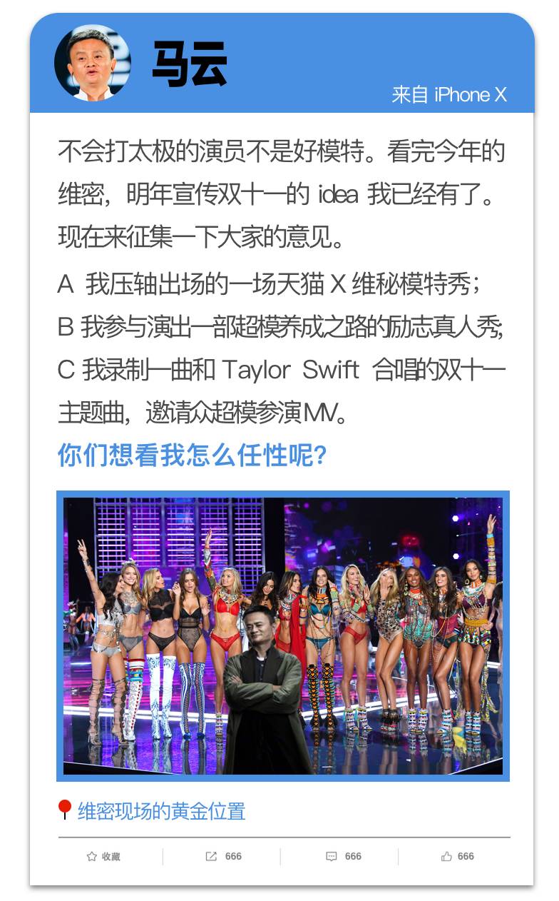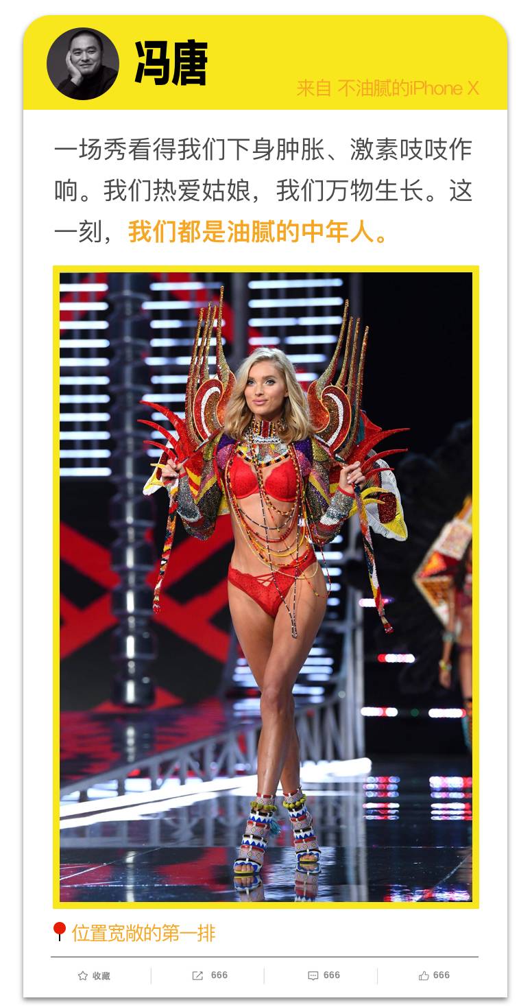 不止是你,那些看惯了大场面的名人明星也被震撼了。不过跟你稍微不同的是,他们在欣赏长腿大胸的同时,还看到了更深一层的“商业哲学”。秀后,他们纷纷发微博向维密祝贺,因为这场洗涤灵魂的商业大秀,他们的商业视野再一次被拓宽了。