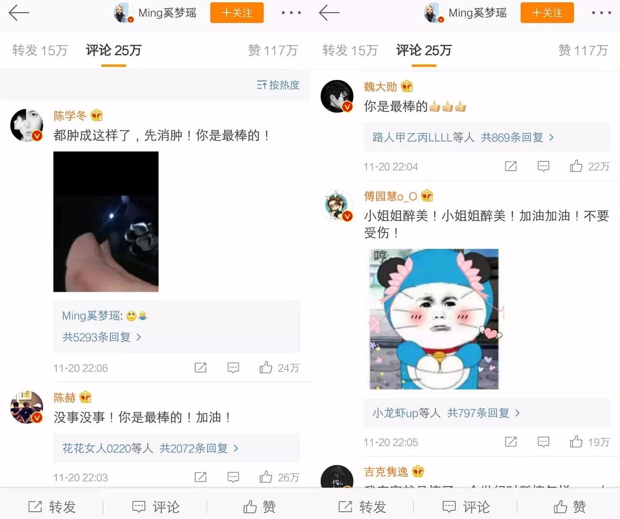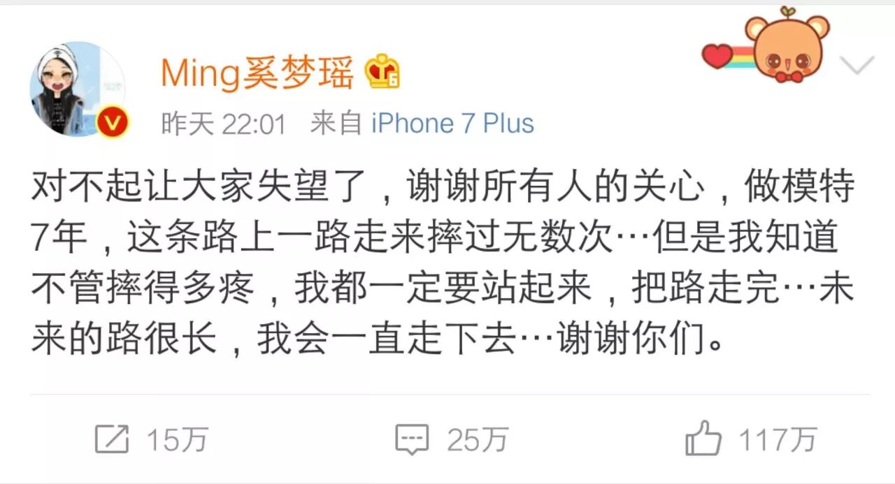 走秀结束后,奚梦瑶发微博表示道歉和感谢,截止发稿前她已收获了117万点赞和25万留言。评论区已经被一众明星好友霸占,他们纷纷留言鼓励。