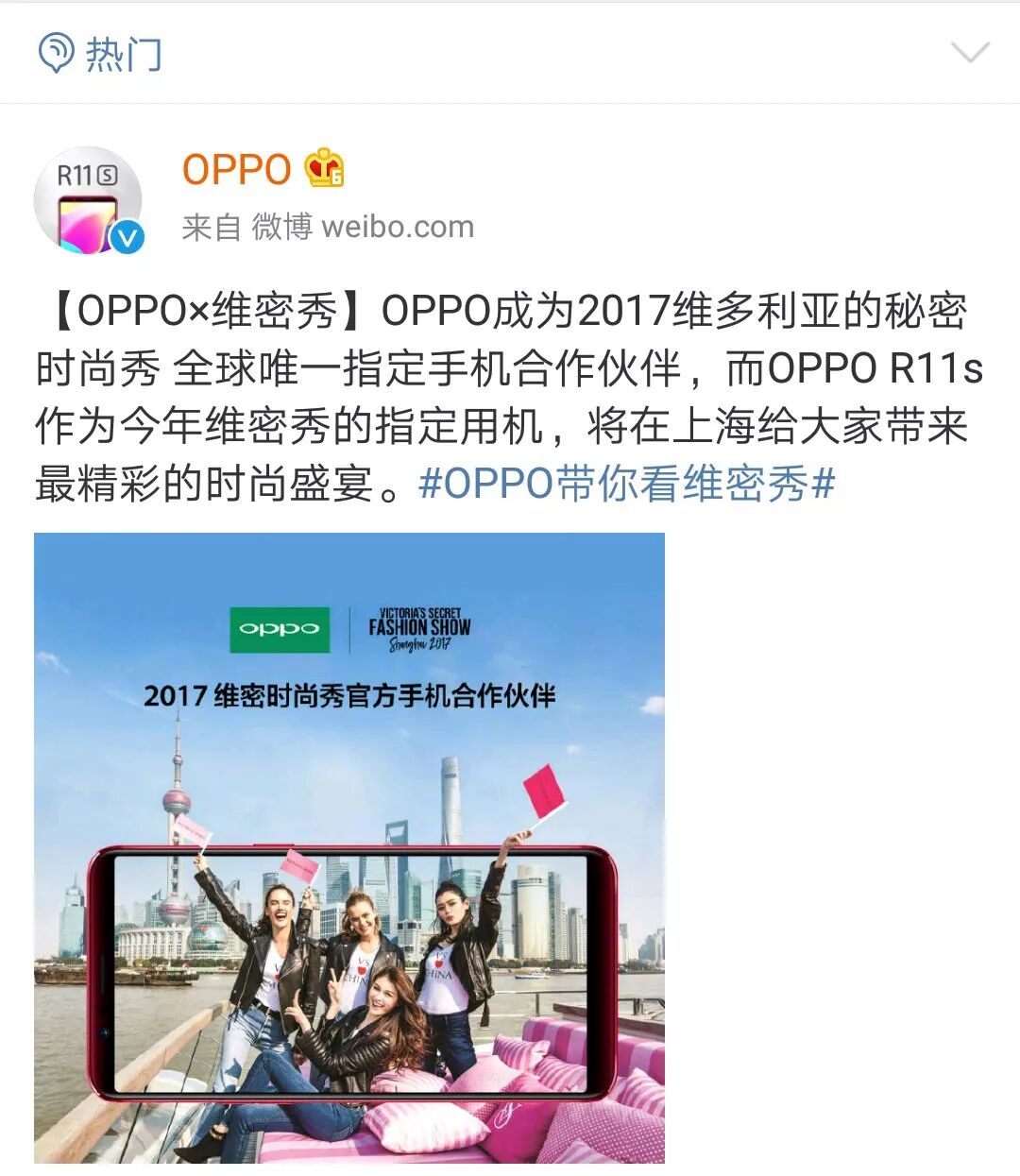 11月16日,OPPO宣布成为2017维多利亚的秘密时尚秀全球唯一指定手机合作伙伴,同时发起话题#OPPO带你看维密秀#,在后台探访维密天使的各种“秘密”,这也是维密和手机品牌的第一次合作;