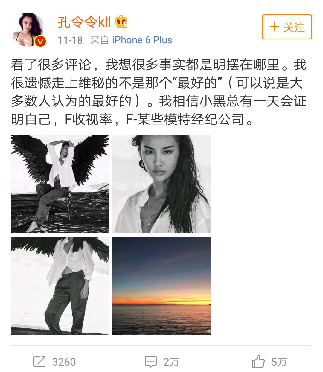 而早在几个月前,一档专为维密秀造势的真人秀节目《天使之路》也在精心策划下,“不可免俗”地爆出各种撕X、争议和内幕,冠军选手王艺如期出现在维密秀场上,却遭到大面积吐槽,同为参赛选手的孔令令则在微博上直接点出“我很遗憾走上维密的不是那个‘最好的’”;