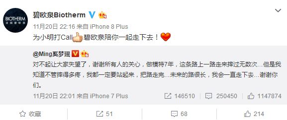 任何的话题性事件都免不了有蹭热度的品牌。17日刚刚官宣的代言商碧欧泉也在转发微博时表示,会一起走下去!