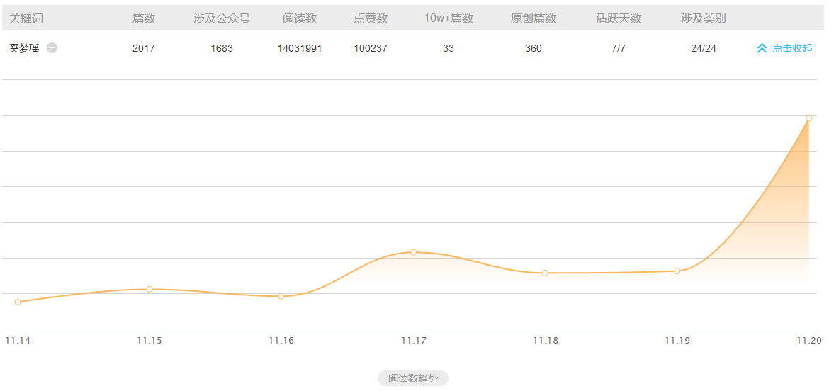 截止到昨晚(11月20日),据新榜数据回采,含有关键词“奚梦瑶”的文章共有2017篇,其中33篇达到10w+。今天肯定还会有一大批相关文章发布,提到奚梦瑶的文章可能会更多。