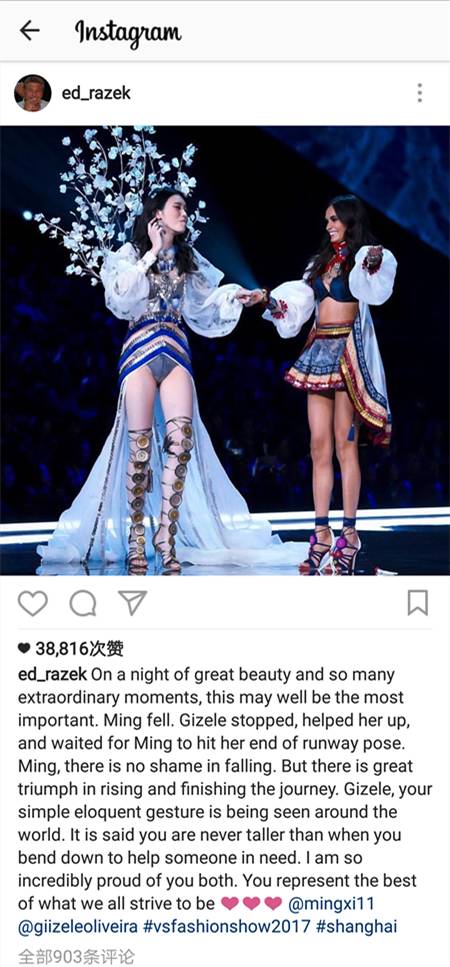 11月21日,维密首席营销官Edward Razek在Istagram上发文回应:“奚梦瑶,摔倒了没什么好丢人的。站起来完成走秀就是巨大的胜利。”