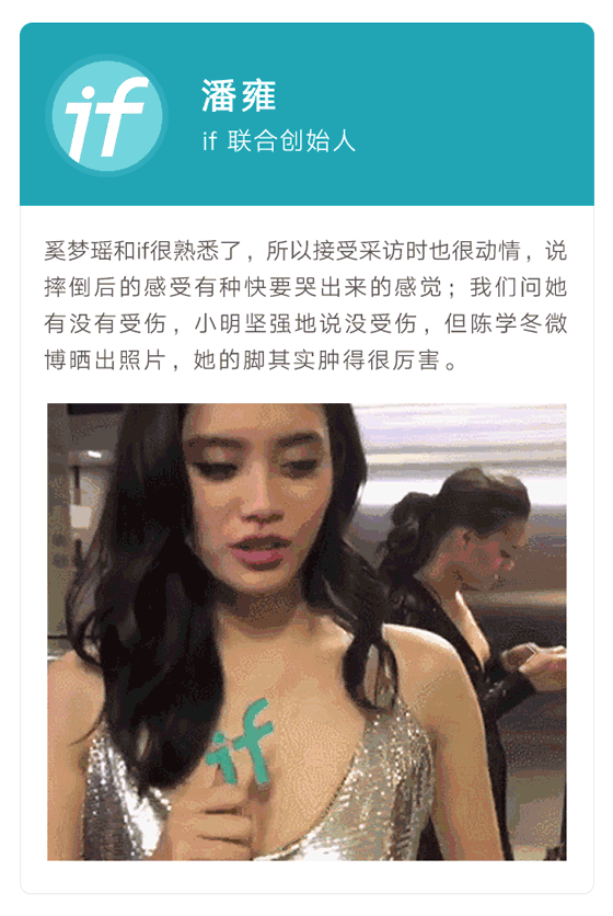 杜绍斐入场前采访了场外的保安和黄牛;if则在奚梦瑶摔倒后第一时间送出后台采访视频,并发文详细介绍了扶起奚梦瑶的巴西超模Gizele Oliveira。