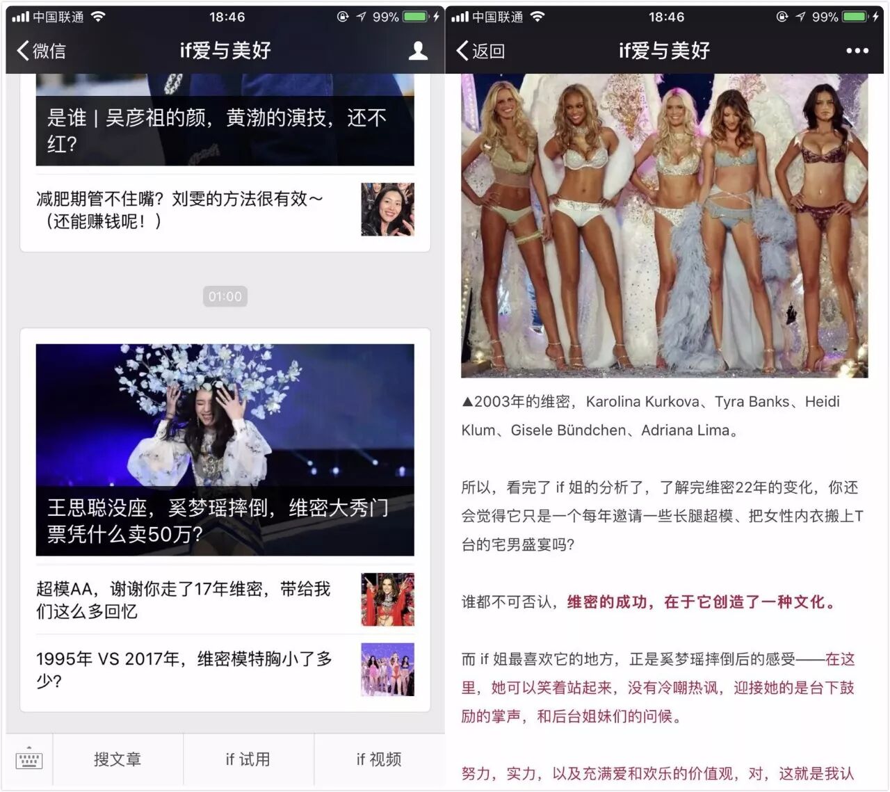 据了解,if 在多平台拥有1500万活跃粉丝,同时覆盖了图文和短视频领域。 if的联合创始人潘雍说,“if 在内容丰富度、口碑和影响力三个维度上都很有优势,这也正是维密品牌所看重的” 。
