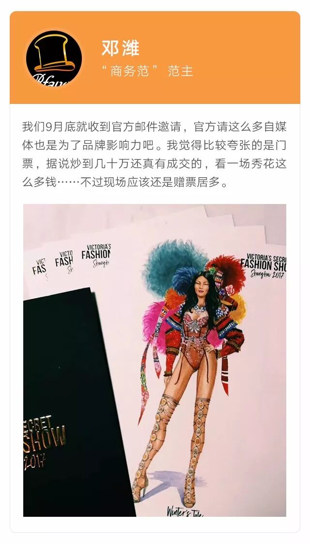 “我觉得不用特别强调维密请自媒体,因为传统媒体也有请,还有很多行业相关的人,杂志编辑,明星经纪人,模特……都会去,增加事件曝光,就像看王菲演唱会品牌商也请了很多媒体。”