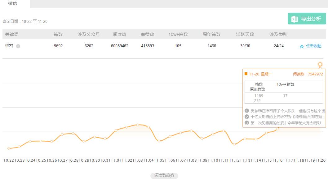 据新榜持续监测的49.3万微信公众号样本数据,仅昨天一天,有1189篇微信文章谈及“维密”,拿下10w+的就有17篇。不仅如此,维密相关话题在微指数、百度指数中也达到顶峰。
