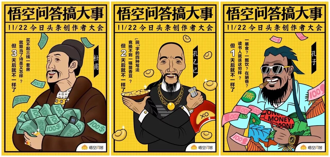 距离今日头条年度创作者大会还有1天,在悟空问答发布的朋友圈海报里,杜甫戴起了金链子,孔夫子玩起了money shooter。