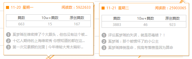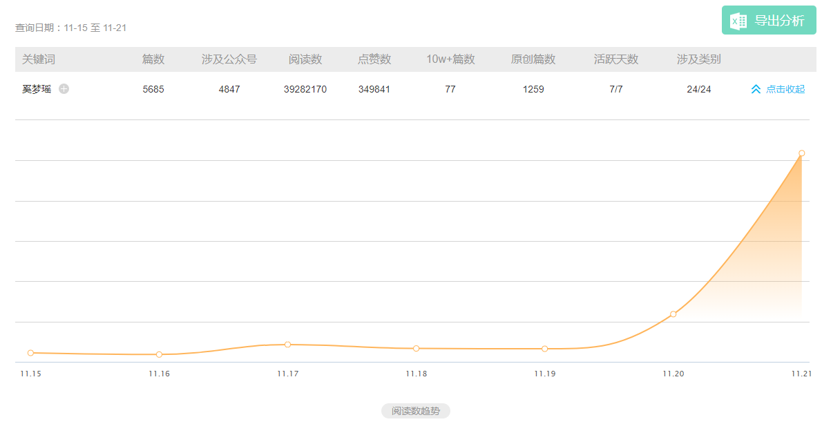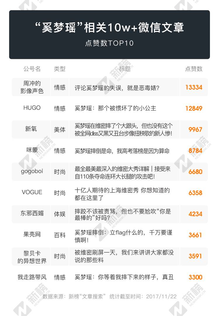 根据新榜日常监测的49.3万微信公众号样本数据,从11月20日维密大秀当天开始,提到奚梦瑶的文章数量猛增。