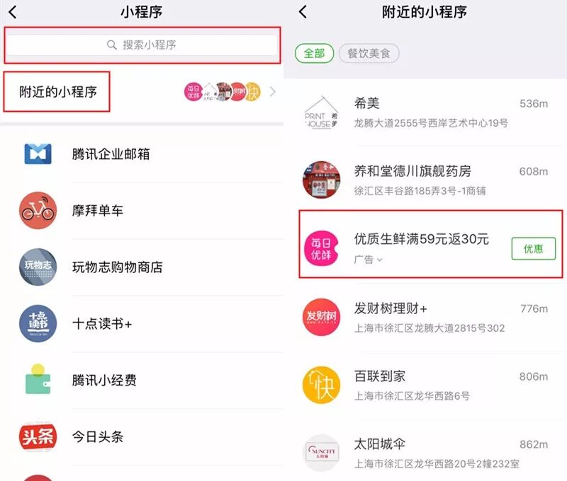 而在小程序的搜索框下,还有一个很重要的二级入口:附近的小程序。基于LBS定位,连接的是线下商场和店铺,附近的小程序也天然有流量。