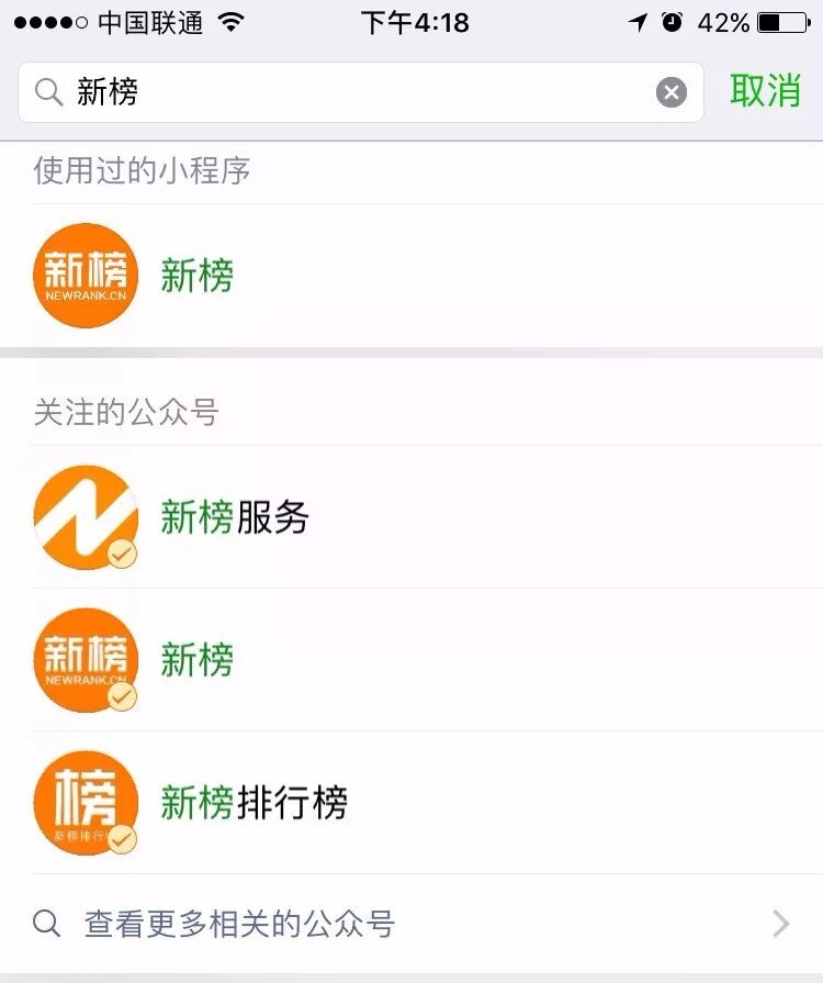 在搜索框里输入内容,从搜索结果优先级来看,小程序目前是优于公众号先呈现的,比如搜“新榜”: