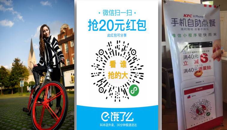 为此,微信还专门打造了小程序码(emmm 被吐槽像菊花的那个)。使用案例,参考近来强势推广小程序的“饿了么”,在外卖包装盒贴上小程序码,提醒用户扫码可获取红包。