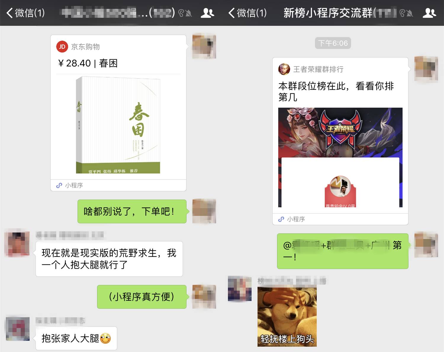 这项能力开始并不被重视,也有开发者做出群内小程序的玩法:比如“王者荣耀群排行”就是最典型的社群玩法,很长一段时间,丢进一个“王者荣耀群排行”成为激活死群的最佳方法。
