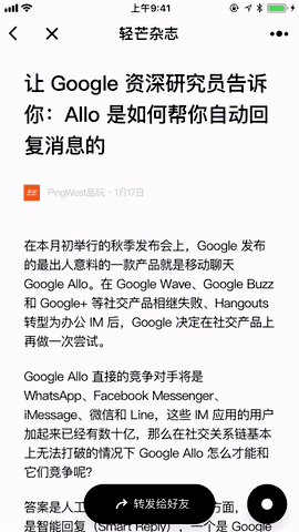 “一起读”最早在轻芒杂志小程序中上线。你可以把文章转发给微信好友,让他们加入一起读。小程序中会实时显示对方阅读进度和标注情况,你们还可以即时对话。这一功能解决的痛点是:微信中阅读常被消息打扰,多人异地无法共同读文章。