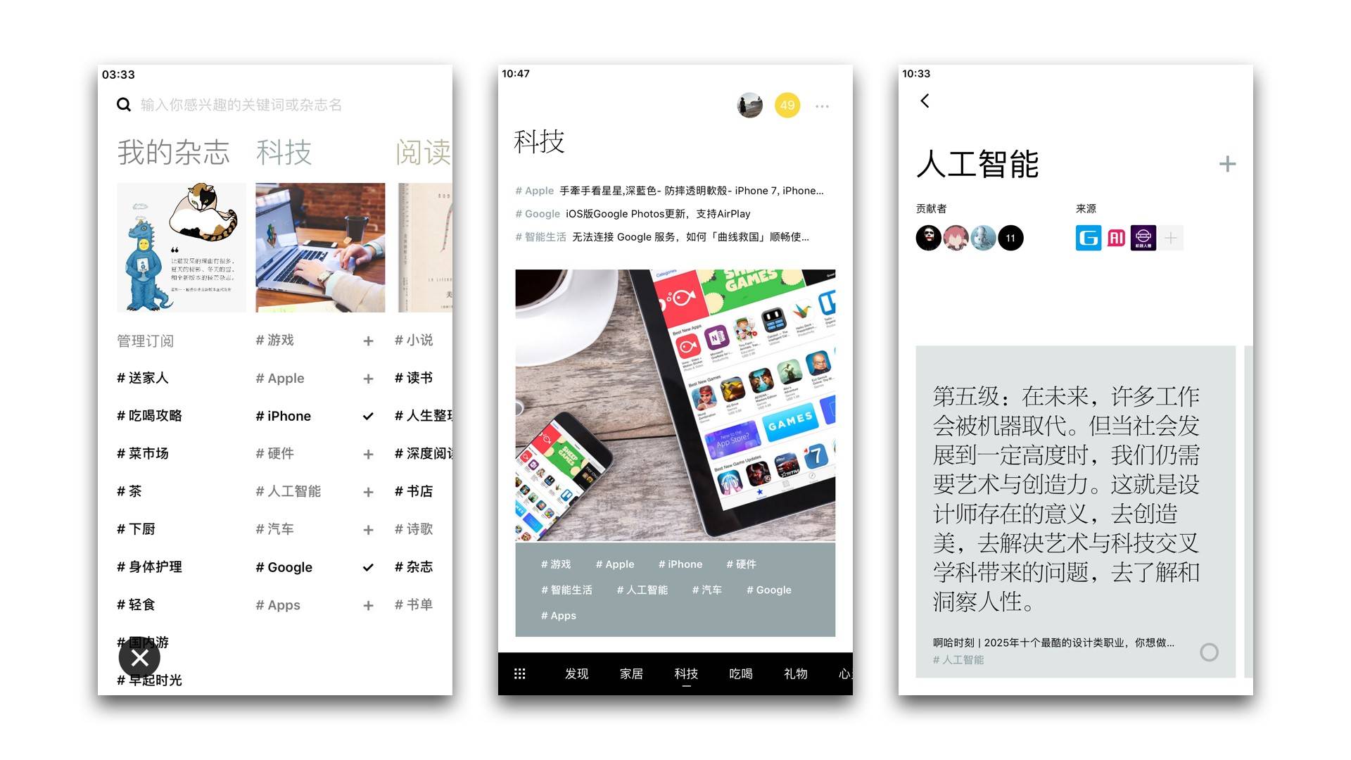“通过对兴趣内容的准确分类、马克挑选好内容的机制,来保证好内容的源源不断。同时,又通过充满呼吸感的设计来保证大家对传统杂志的好观感。”