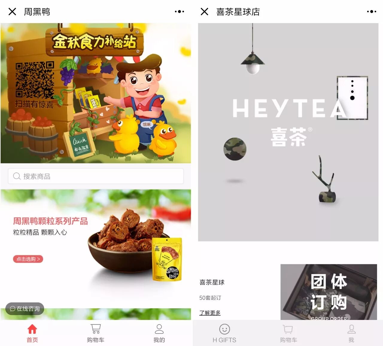 “周黑鸭官方商城”、广州老字号“陶陶居”和网红“喜茶”通过电商小程序,售卖食品或周边,让用户在家就能收到好吃的食品和好玩的周边。