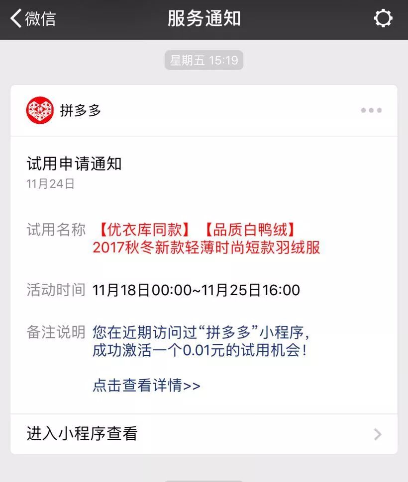 在解决了流量难题之后,拼多多还通过模板消息解决了“用完即走”的尴尬,通过高频推送,唤醒沉睡用户。一旦用户打开过拼多多的小程序,哪怕没有任何购买记录,拼多多也会用向用户频繁推送活动信息。