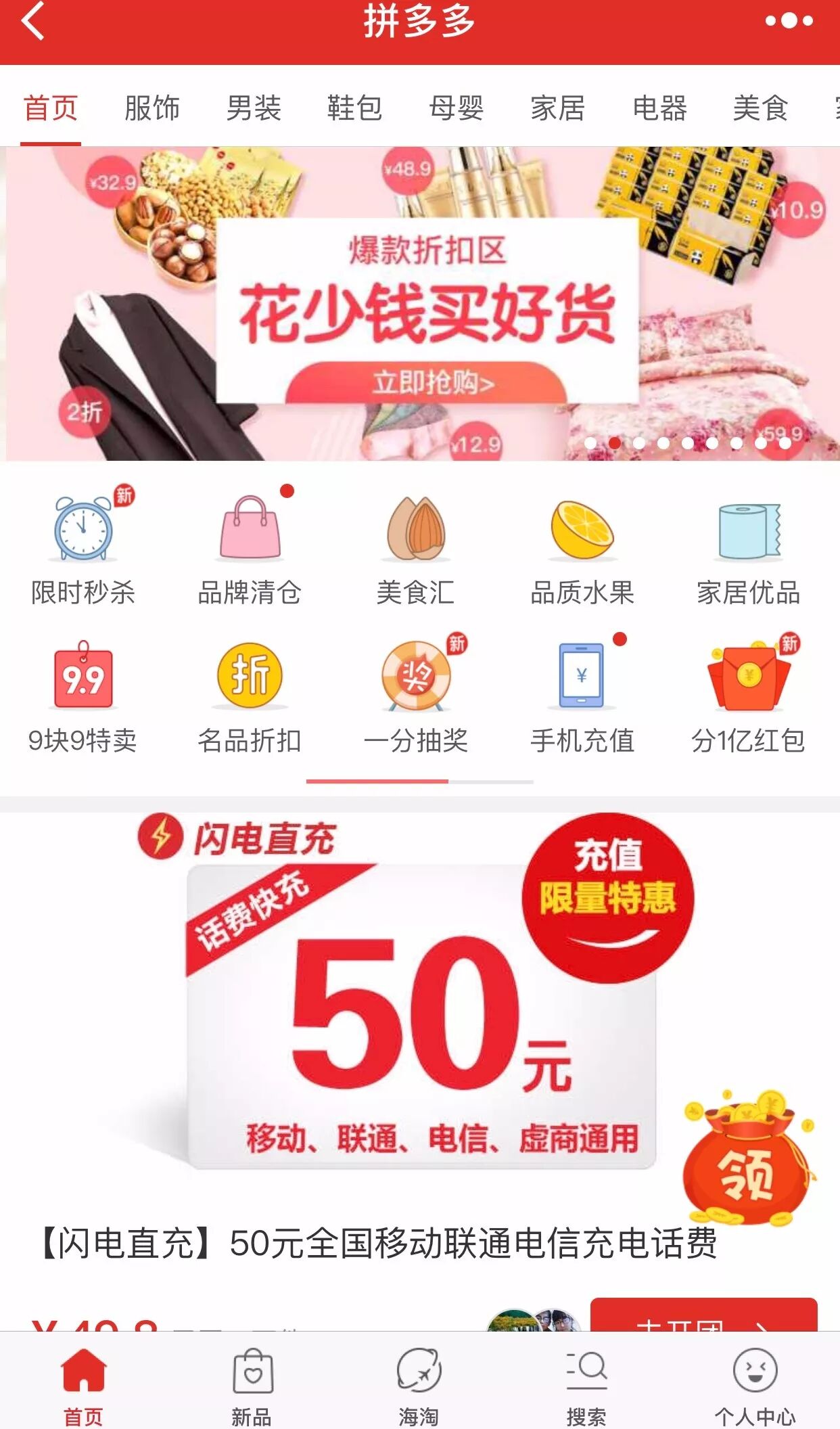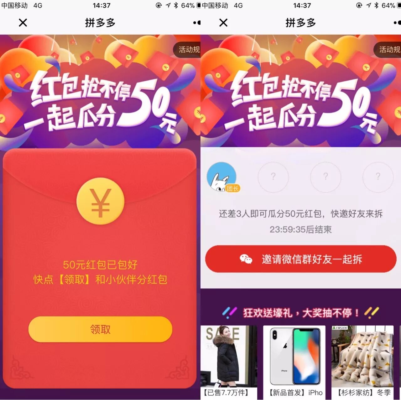 “拼团”的场景,在拼多多小程序中无处不在。哪怕你只是刚打开小程序,也会立刻弹出一个拼团凑红包的界面,鼓励你邀请好友共同拆红包。不过,拼团得到的红包,必须购物满100元才能使用。