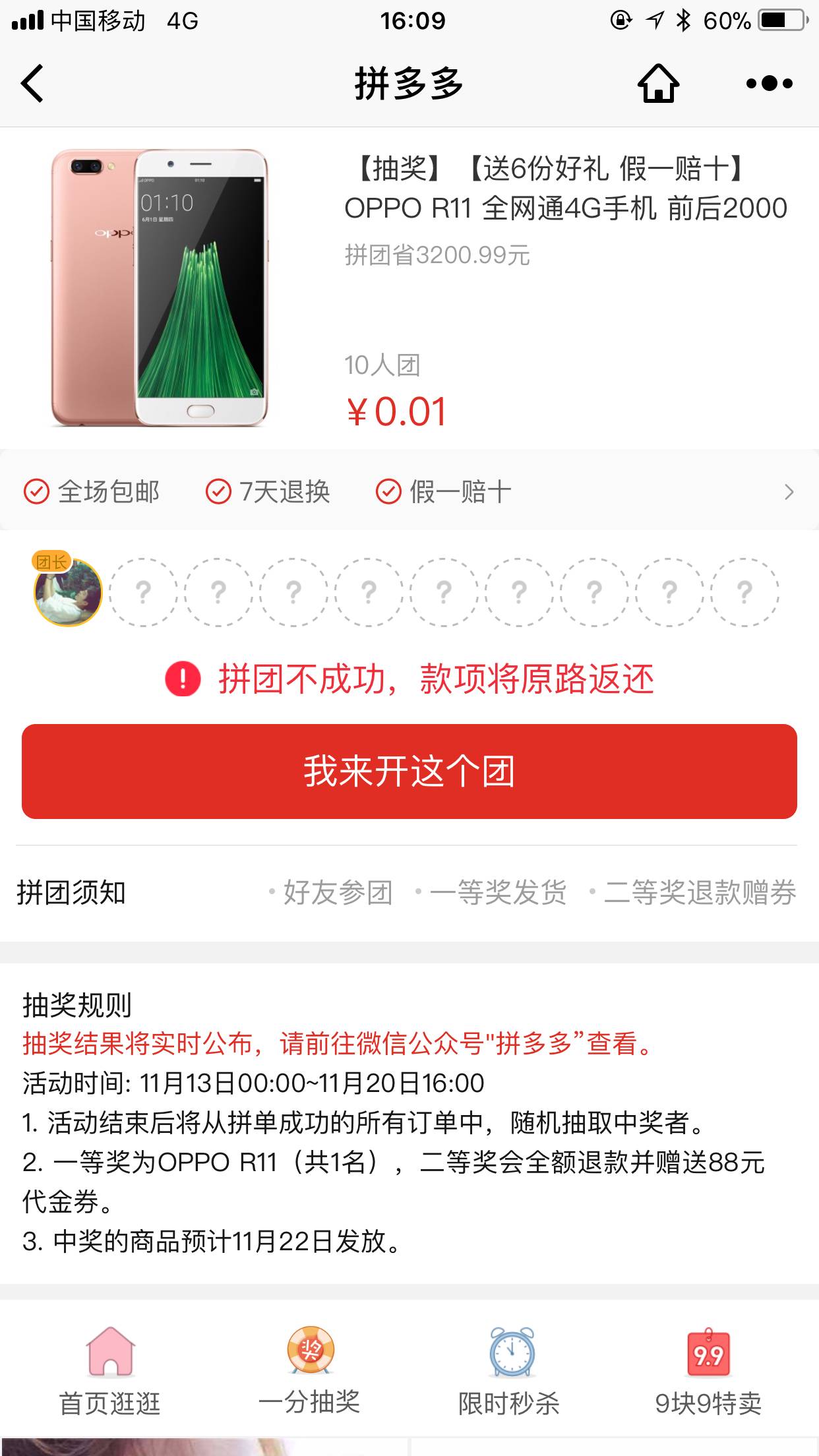 与之类似的,还有“1分钱拼手机”的活动。乍一看,组团成功就能“白捡”超值商品,其实这只是一张抽奖“彩票”。