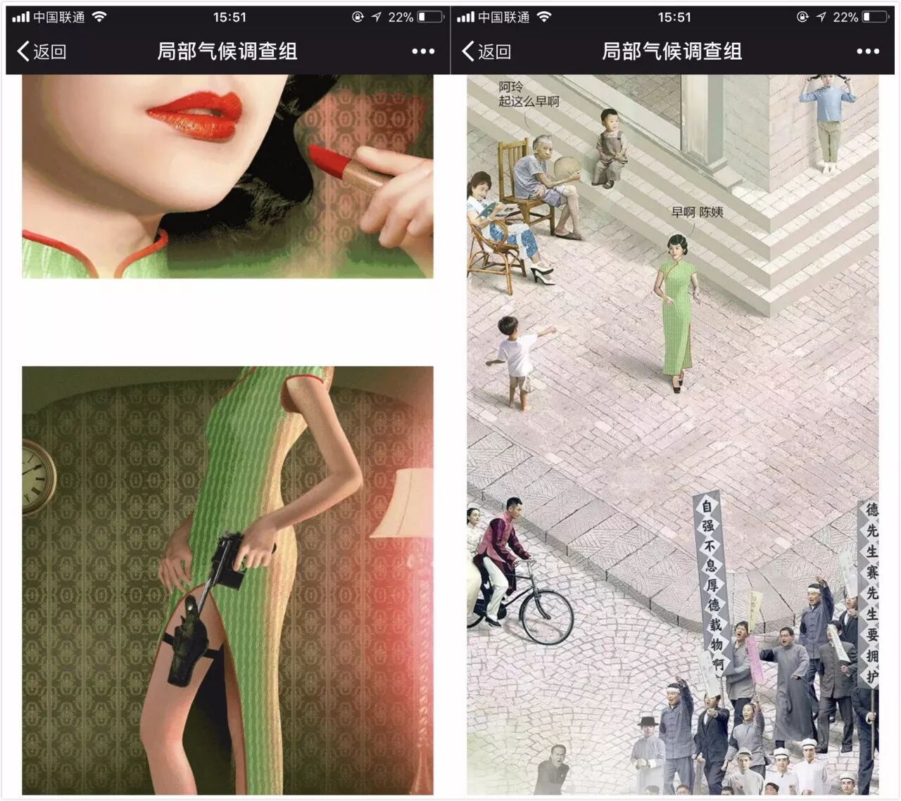 “局部气候调查组”的内容可以说是长图中的长长图了,主打一镜到底,一张图一口气拉到底,据说这些超长图文最初能达到30多米,为了用户体验慢慢缩短为7-8米乃至更短。