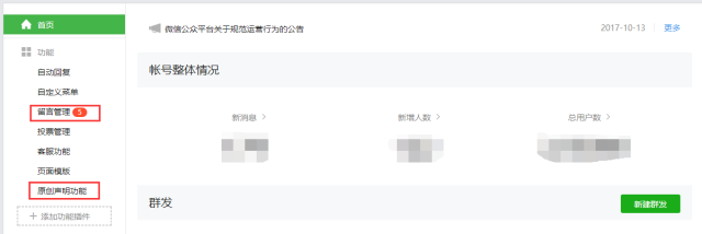 没有用过原创和留言的朋友们也不要着急,如果原创声明和留言功能已经开通,你们会在公众号左边的菜单栏里看到。