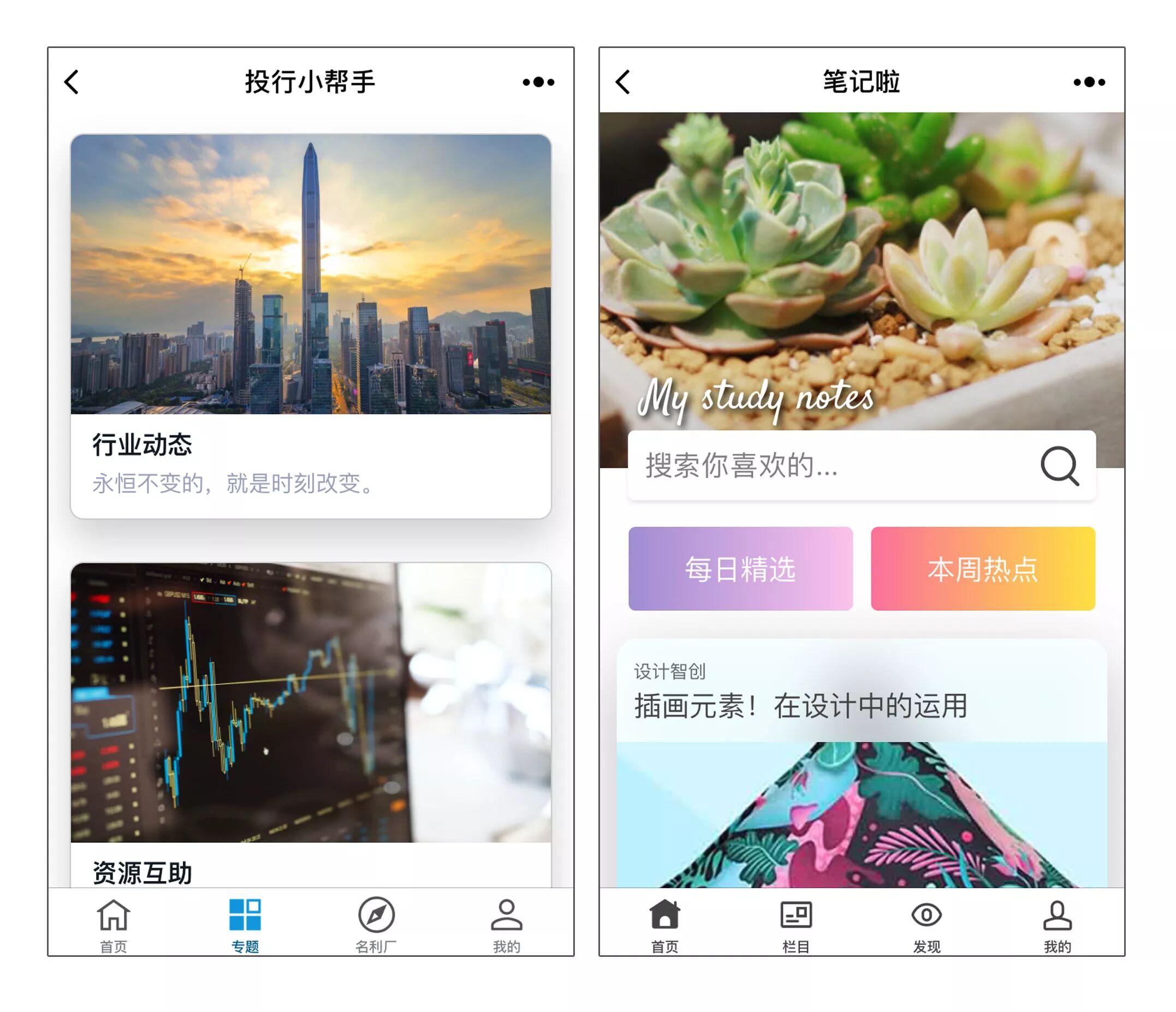 可自定义首页轮播图、内容栏目(主题),以及在小程序内进行搜索。
