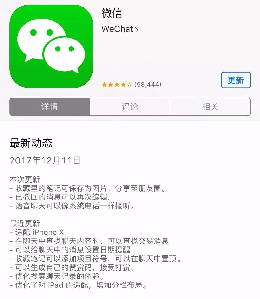 另外,本次微信更新的内容还有收藏里的笔记可保存为图片、分享至朋友圈,已撤回的消息可以再次编辑,以及语音聊天可以像系统电话一样接听。
