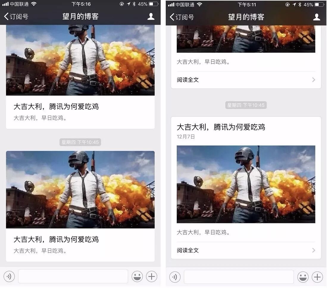 而对于多图文消息,头条标题上原来的灰色框不见了,封面图可以完整展示出来。这也意味着对头图的要求更高,如果头图颜色太浅,标题看起来会不太清晰。