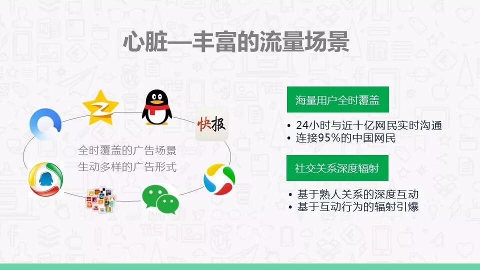 腾讯社交广告囊括微信、QQ、QQ空间、QQ浏览器等覆盖不同年龄层、特点各异的社交平台,及海量行业的头部流量,能够为广告主提供全时覆盖的广告场景和丰富的广告形式,为不同的营销目标带来海量曝光。