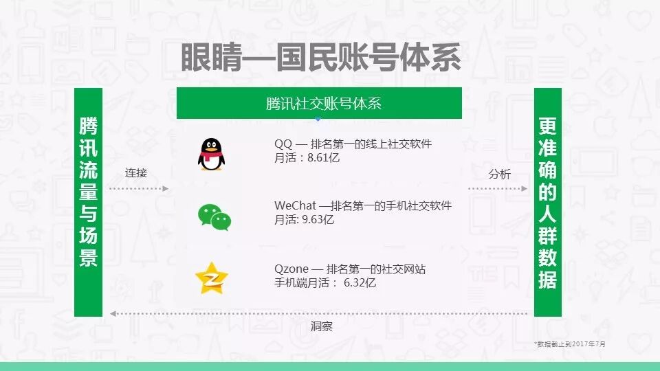 腾讯社交广告拥有覆盖全国95%网民的腾讯强ID账号体系,具有低门槛、高效率;多平台、广覆盖;数据洞察,精准触达的强大优势。