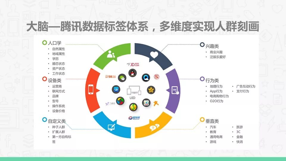 腾讯社交广告以QQ与微信两大国民账号体系,跨屏跨场景打破数据孤岛。广点通的数据洞察及人群标签体系,能够围绕基本属性、媒体行为和用户行为等多个维度实现目标人群刻画。