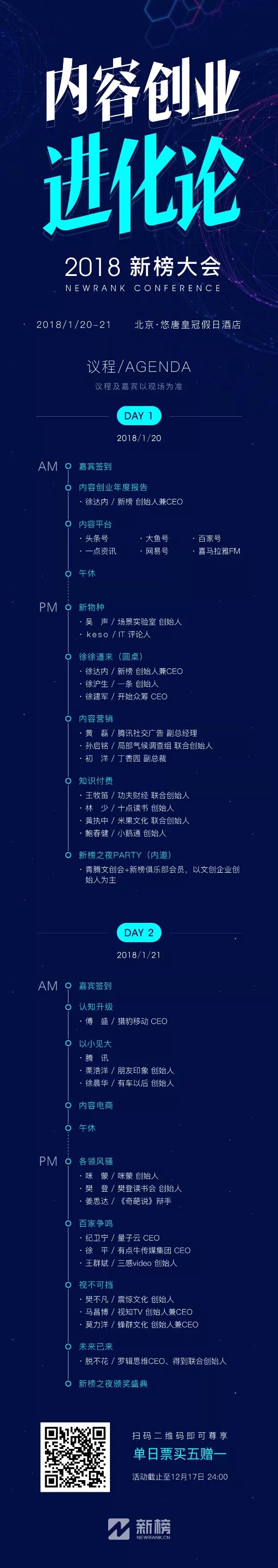 不过各位可能忽视了一个细节。今年的新榜大会为期两天,这意味着,日理万机的你只要其中一天有空,就可以参加新榜大会。那么,到底哪一天更值得去呢?