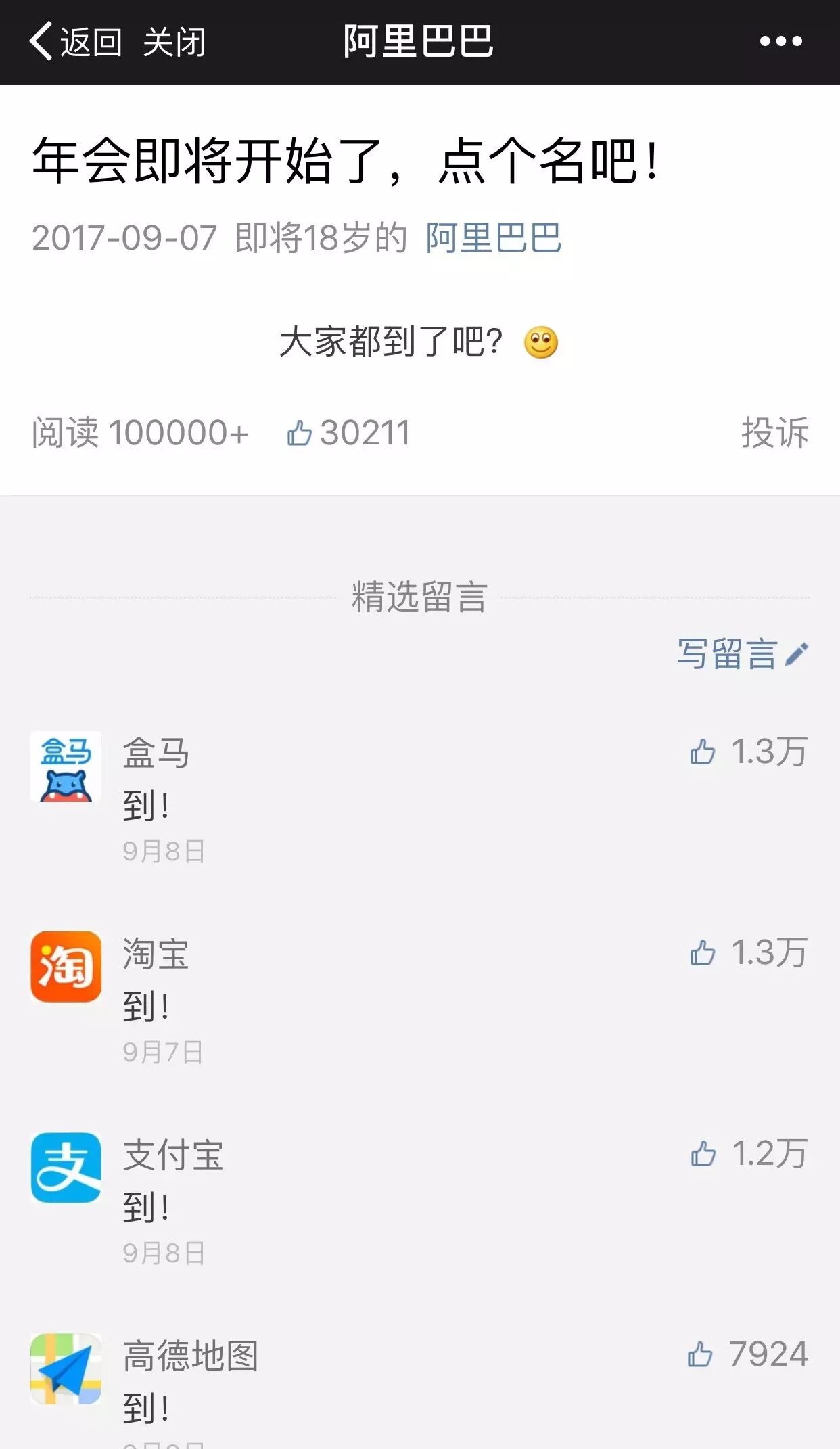 阿里巴巴微信矩阵:举个最近的案例:9月8日阿里巴巴官方微信公众号推送一篇“年会即将开始了,点个名吧!”的文章,文章内容只有一句话:“大家都到了吧”。整个阿里巴巴微信公众号矩阵在评论区回复,瞬间10万+,互推、裂变、宣传效果都达到了。