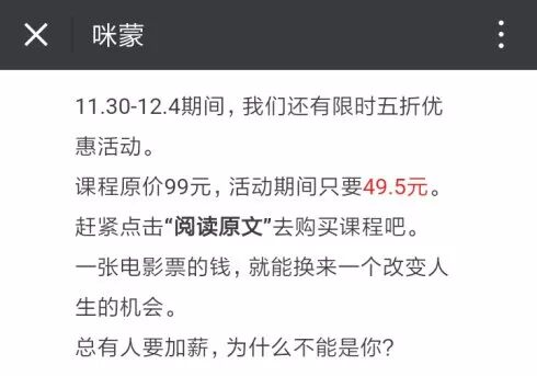 这里咪蒙还小玩了一把营销中常用且非常有效的参照对比手法,把一张电影票的钱作为课程的价格参照,就是告诉大家一点都不贵。