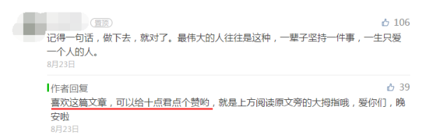 「十点读书」的点赞指引比较特别的是,它将指引的信息延展到了“置顶留言”的回复栏,很难让人忽视。