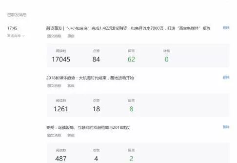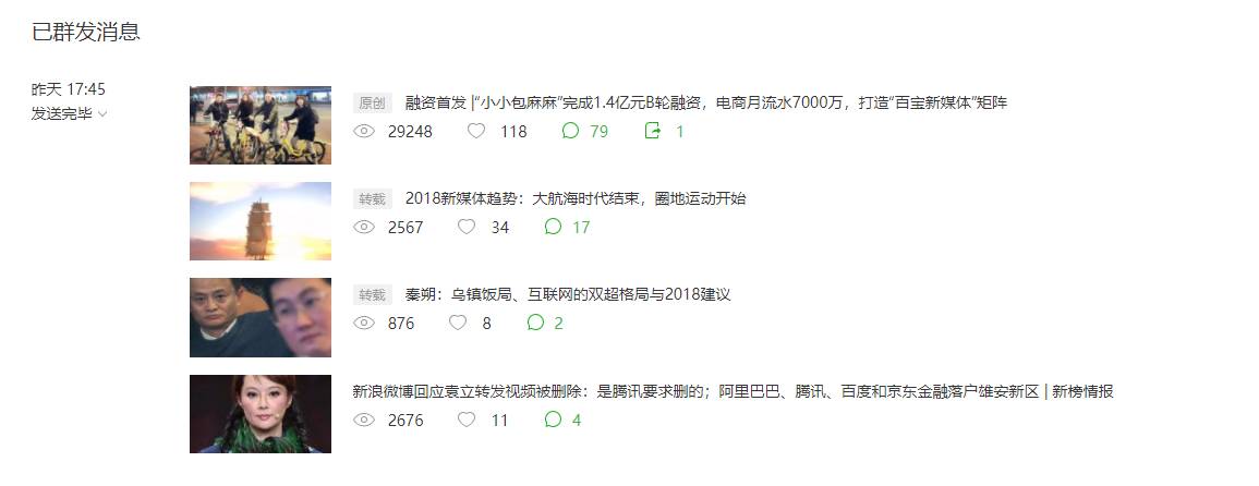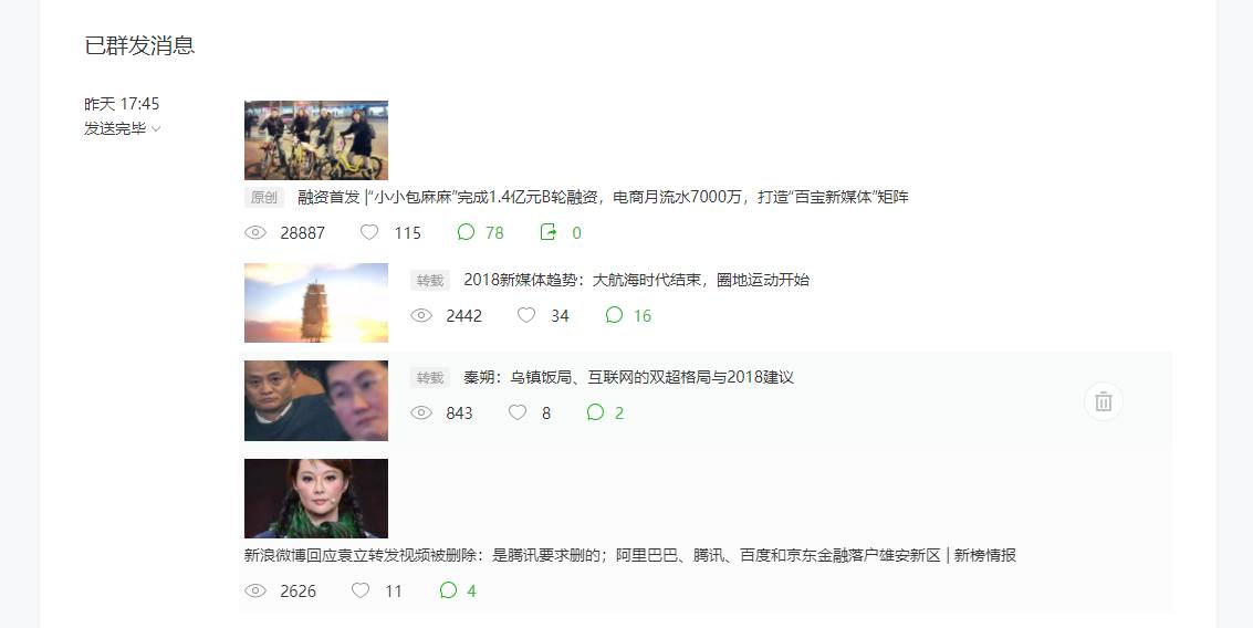 对比之前的已群发消息界面,会发现数据没有那么突出了,阅读数、点赞等也从文字变成了小图标,加强了可视化的元素。