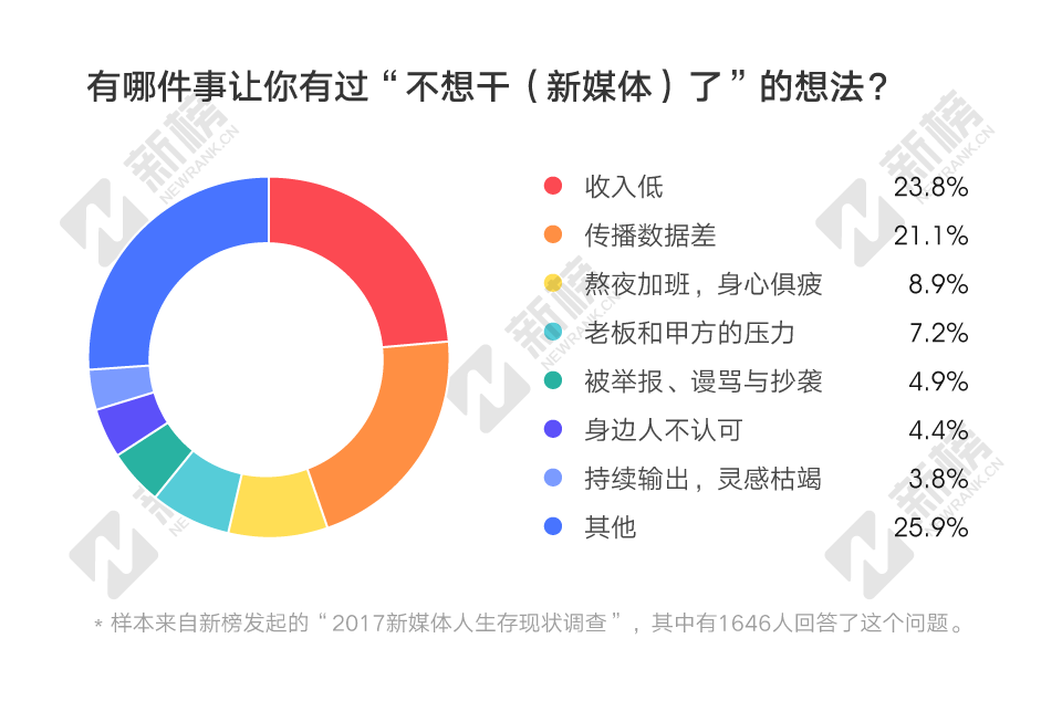 如上图所示,在“有哪件事让你有过“不想干(新媒体)了”的想法”的回答中,最多人提到了经济压力,同时有相当一部分人提到传播数据差,投入与回报不成正比。