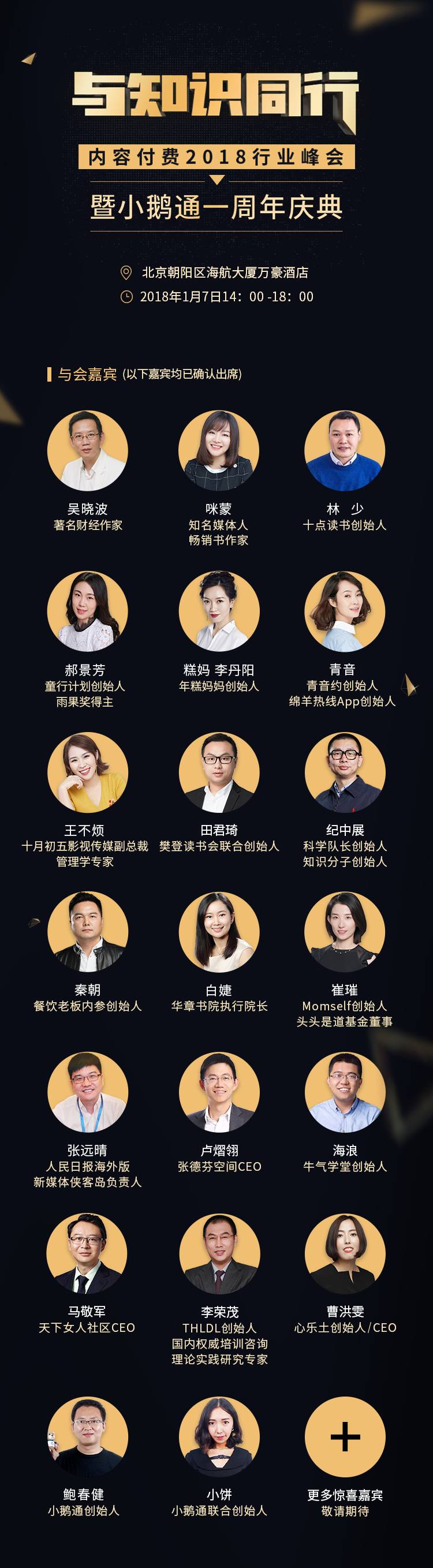 新榜讯 2018年1月7日,小鹅通将在北京举办内容付费2018行业峰会暨小鹅通周年庆典,吴晓波、咪蒙、林少等大咖均会出席。